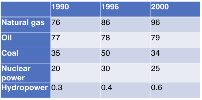 The table illustrates the changes in the total amount of energy produced by five different types of fuel in the UK in the year 1990, 1996, and 2000.