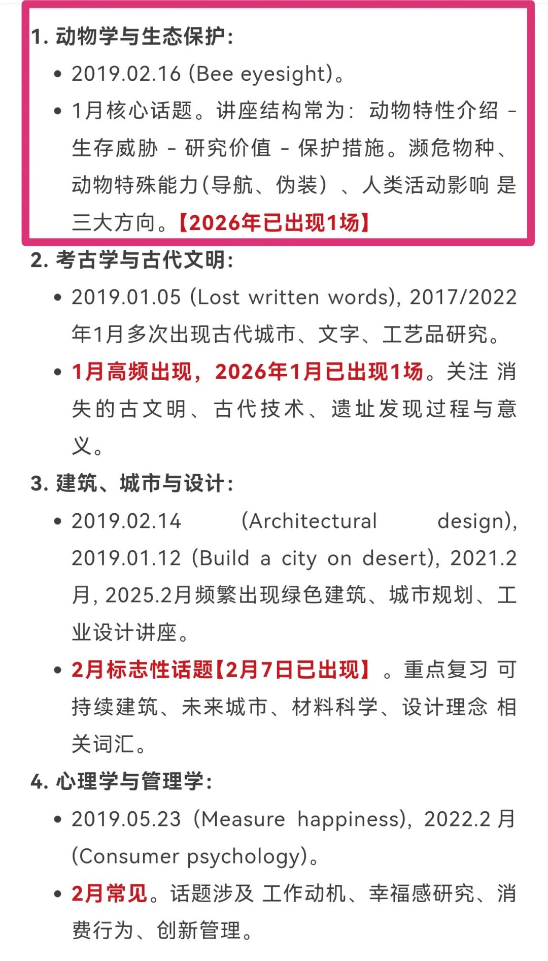 动物研究:Section 4的超级高频主题。例如2017年的非洲鳄鱼,2021年的乌龟实验,2022年的海豚智商、昆虫研究,2025年的动物夜行研究。这要求考生对动物生理特征、习性、保护等方面的词汇非常熟悉。