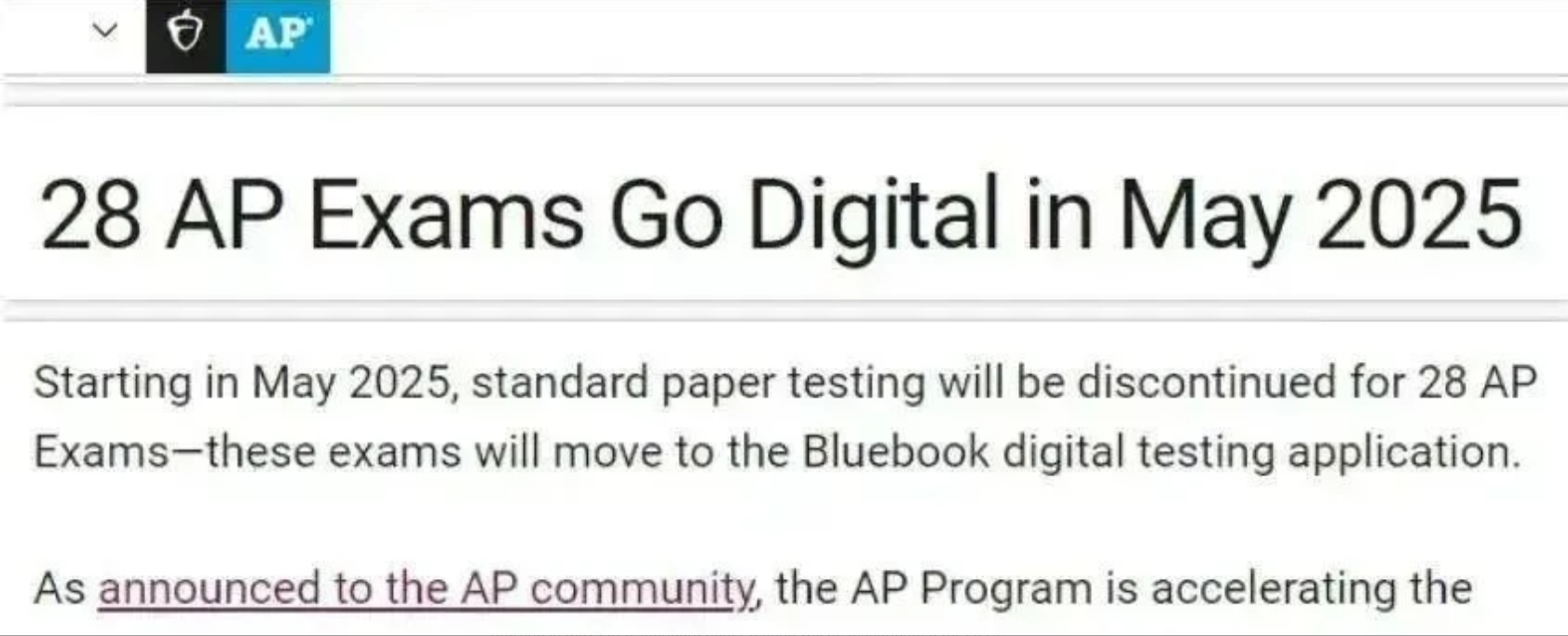 美国大学理事会(College Board)近日宣布,自2025年5月起,28门AP考试将全面停用纸质形式,统一转为通过Bluebook数字测试应用进行。